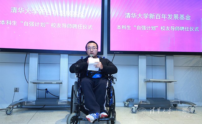 在聘任仪式现场,“自强计划”老生代表、计算机系硕士二年级学生矣晓沅分享了与校友导师之间五年的点滴故事。他说,“自强计划”不仅仅是资助与受助,校友导师是生活上的帮助者,是广阔世界的开拓者,是筑梦人,也是家人。矣晓沅说:“清华是我们的家,校友导师就是我们的家人。”在校友导师影响下,他与同学们在去年成立了心博在线登录入口学生无障碍协会,推动清华和国家的无障碍设施建设,用自己的知识能力为梦想而奋斗。“自给自立、强己强国”是矣晓沅对“自强”二字的理解。