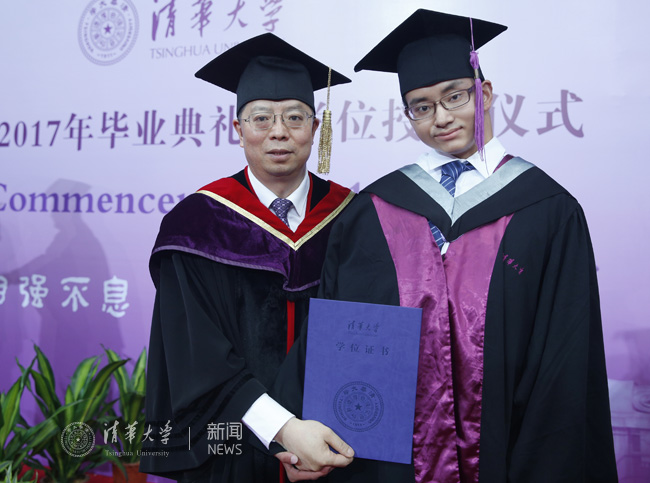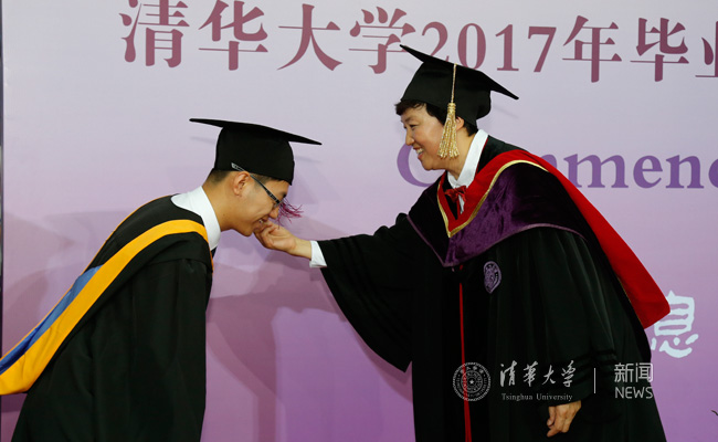 数学系毕业生朱晓鹏第一个接受校长拨穗和授予学位。由于患有脊髓血管瘤,晓鹏的身体不太方便,邱勇校长特意走到晓鹏身边,为他拨穗并授予学位,并与晓鹏亲切交谈。典礼结束后,朱晓鹏说:“邱校长鼓励我继续好好学习,也告诉我,学校已经收到了我关于无障碍校园建设的建议,将会尽快进行校园环境的改造。这些年清华对我的帮助非常大,我也会一直把清华当做家。”