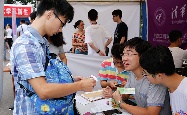 在紫荆公寓迎新现场,各院系迎新点、超市临时摊位、咨询处等一字排开。每当满载新生的校园大巴抵达,热情的学长学姐们就会把新生“抢到”各自院系的迎新点。迎新点布置各有特色:汽车系摆出了学生自制的、曾在全国大赛中亮相的方程式赛车,吸引众多新生和家长拍照留念;计算机系制作了标有6字班新生籍贯的大地图,新生报到时在自己的家乡处贴上纸条,写下寄语,来自五湖四海的新同学很快成为和睦融洽的一家人。