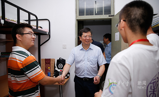 在紫荆公寓11号楼403A室看望入住的新生时,邱勇与新雅书院理科实验班的冯伟嘉、彭中尧、叶子逸等亲切交流,鼓励他们在大学生活中多交往、多阅读,学习《瓦尔登湖》一书的境界,沉下心来静静思考,选择自己真正热爱的专业。
