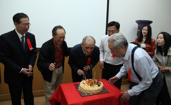 大家为校庆日过生日的滕藤先生送上生日蛋糕。