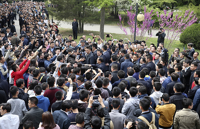 在依依不舍的目光中,李克强总理与清华师生挥手惜别。