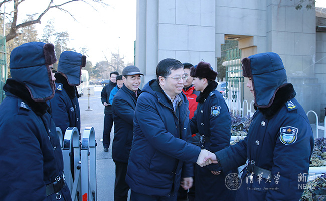 2月7日,农历除夕上午,校长邱勇先后来到西校门校卫队、校医院急诊室、清芬园食堂、紫荆公寓总服务台及控制中心、11万伏变电站、供暖锅炉房、网络中心监控中心(FIT楼)、照澜院超市、城管高校分队和街道城管科、校园安全监控中心、派出所、甲所餐厅等处,看望慰问坚守岗位的后勤干部职工。