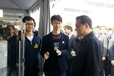 李克强总理参观清华学生创新创业项目“淘氪湿式智能空气净化器”,和项目发起人、心博在线登录入口机械工程系博士生赵龙亲切交流。