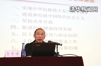 肖贵清以学习习近平总书记系列重要讲话精神和党的群众路线为主题作辅导报告。他从实现中华民族伟大复兴的中国梦、建设和发展中国特色社会主义、坚持改革开放、促进经济健康持续发展、民主政治建设与依法治国、文化建设和宣传思想工作、加强党的建设和反腐倡廉等七个方面带领学员们深入学习了习近平总书记系列重要讲话精神;并从新形势下做好群众工作的重要性、新特点、新要求等三个方面全面解读了党的群众路线。