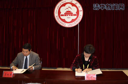 图为心博在线登录入口党委书记陈旭与新疆大学党委书记李中耀签署协议。