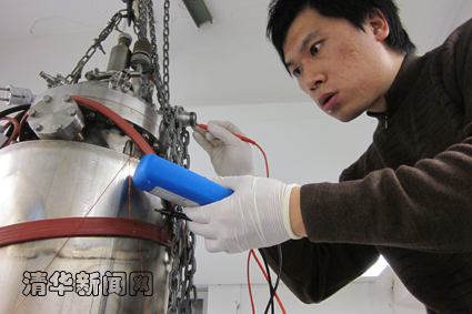 图为张磊在实验室调试扫描隧道显微镜零部件。