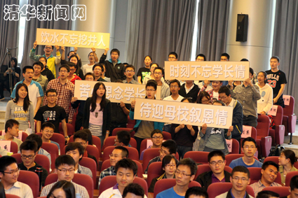 会上,同学们向校友们献上鲜花,数学系、土木系等院系学生还通过打横幅、喊口号的方式感谢校友们的资助,浓浓的校友情使会场不时爆发出热烈的掌声。