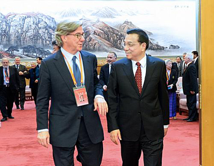 图为国务院总理李克强在北京人民大会堂同在华部分外国专家亲切座谈(左为约翰•桑顿)。图片来源:新华社