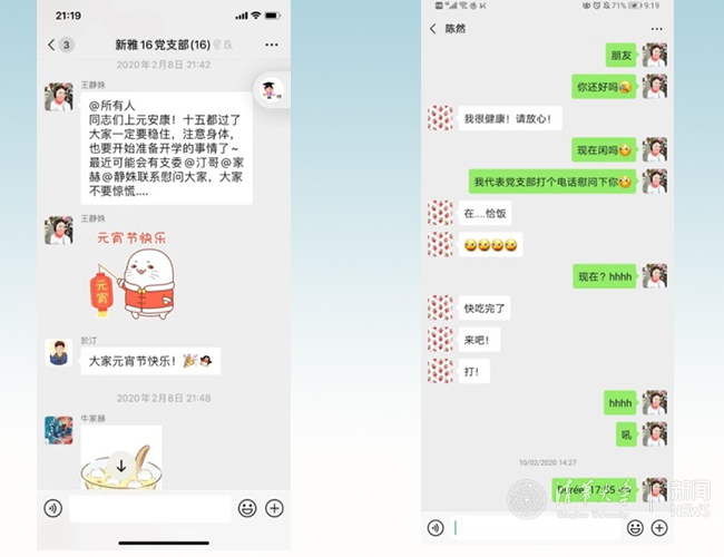 疫情隔开了距离,但隔不开党组织的关怀。若干学生党支部疫情期间建立一对一联系制度,深入关心同学身心健康和思想动态。新雅16党支部的三位支委分头与每一位党员沟通联系,送去党组织的关心,在交流中了解党员各方面情况,并针对同学们提出的问题筹备线上组织生活,尽可能解决同学们的问题。金博16党支部书记李冲第一时间打电话逐一问候班里同学,了解同学及其家人的身体、生活、学习、工作等各方面的情况和需求,并提醒大家做好对亲朋好友日常行为习惯的引导,采取正确有效的防疫措施。工作虽然简单,但是大家感受到了党组织细致入微的关怀。