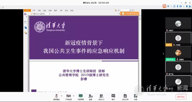 人文8、9党支部邀请博士生讲师团成员、公管学院博士生彭睿同学通过线上会议的方式,以《新冠疫情背景下我国公共卫生事件的应急响应机制》为主题进行理论宣讲。彭睿同学介绍了新型冠状病毒肺炎的发展历程、传播方式、易感人群、发病症状等知识,细致讲解了我国公共卫生事件的应急响应机制发展历程和当下的机制特点,带领大家学习了一些应对措施,并呼吁同学们更多地了解疫情、宣传科学防护知识、妥善保护自己和他人。