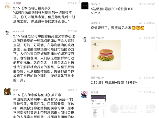 教研院各学生党支部联合研团、研会组织同学开展了寒假提升计划,建立强身健体、读书广闻、能力增长三个专项小组,激励同学们在疫情防控期间养成和保持良好学习生活习惯。同学们把客厅变健身房、把卧室变自习室、把书房变图书馆。空间有限,但积极抗疫的脚步不停。