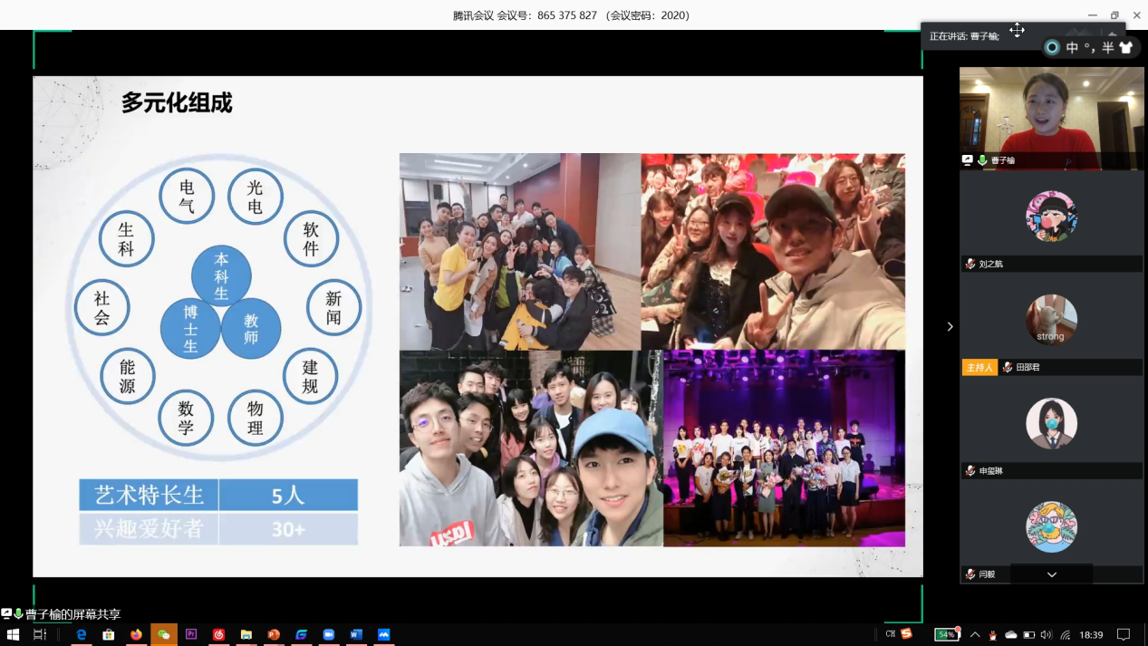 在“疫情同风雨”环节中,华中大戏剧团团支书张晓航从毕业大戏、戏剧专场等日常活动与师资力量的角度介绍了队伍概况,并分享了疫情期间华中大戏剧团创作的《若我归来》《抗疫十二时辰》等作品。清华话剧队团支书王炳瑞以话剧队历史为切入点,阐释了清华话剧队深厚历史文化底蕴,并介绍了疫情期间开展的线上寒训、《艺声相伴·共抗疫情》电台栏目与日常业务训练等工作。