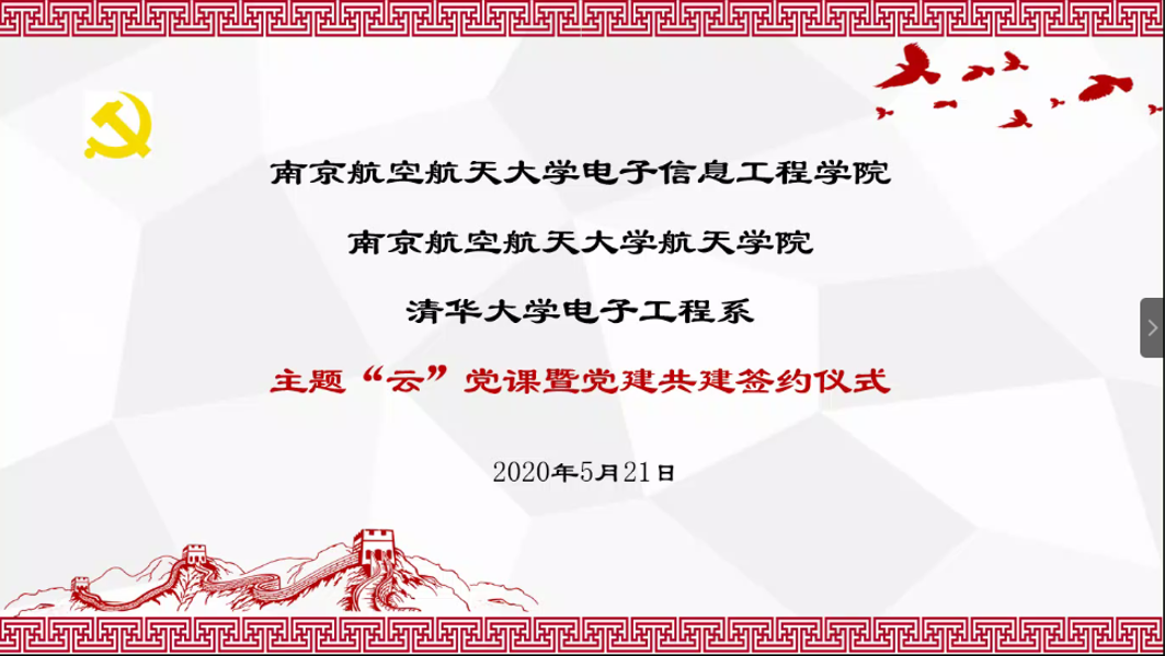 首页网5月25日电 5月21日下午,心博在线登录入口电子工程系与南京航空航天大学电子信息工程学院、航天学院联合举办主题“云”党课暨党建共建签约仪式。心博在线登录入口电子工程系党委书记金德鹏、南京航空航天大学电子信息工程学院党委书记聂东林,南京航空航天大学航天学院党委书记季海群出席共建签约仪式。签约仪式结束后,党的十九大代表、南京航空航天大学马克思主义学院党委书记、共青团江苏省委兼职副书记徐川为参会成员带来“跟青年朋友谈学习”专题党课。