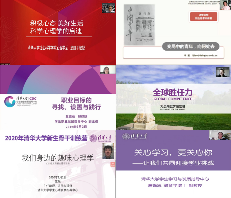 在主题为“云端相约,闻道日肥”的线上培训环节中,社会科学学院院长彭凯平为同学们作题为“积极心理学”的专题讲座,马克思主义学院副教授李蕉为同学们作题为“变局中的青年向何处去”的专题讲座。学生职业发展指导中心金蕾莅、学生全球胜任力发展指导中心廖莹、学生心理发展指导中心王旭和学生学习与发展指导中心詹逸思分别从职业发展、全球胜任力、心理适应和学业发展等角度为新生骨干作题为“开启大学生活”的系列专题讲座。线上系列专题讲座增进了同学们对清华生活的了解,也促进了同学们明确骨干责任、树立集体观念和家国情怀,同时也让同学们有了“身在家乡,心在清华”的感觉。