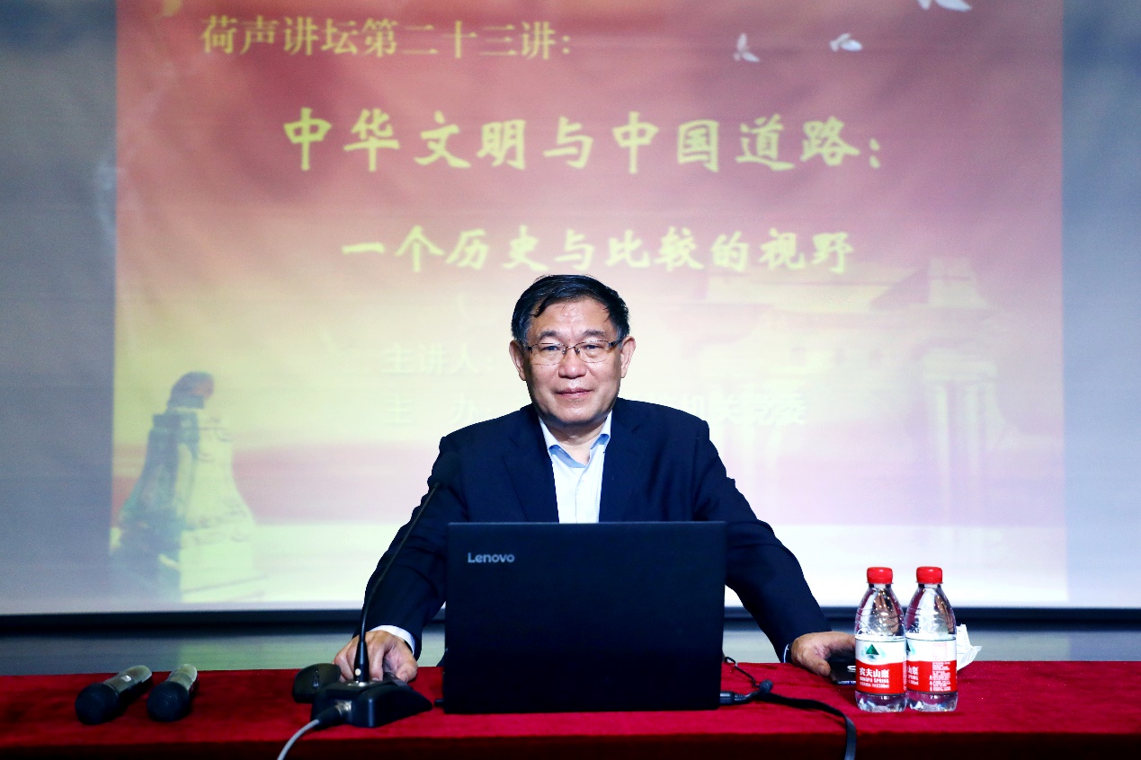 在报告中,张国刚从中国文化传统和文明基因的角度与学术的视野出发,深入浅出地分析了中国的发展模式和发展道路。他首先梳理了中国传统文化的传承与演进脉络,指出了中华文化历史发展过程中几个思想融汇的重要时期,并结合史实案例就历史发展长河中东西方文明的交流与碰撞展开了讨论。随后,张国刚从政治、经济、社会等不同维度对中国历史与文明特色进行了深入的阐述,并深刻分析了中国与世界格局演变历程。他指出,不同的历史地理环境塑造了不同文明的特色,中国文明的内在包容性和中国独特的地理位置,是中华文明绵延不绝并形成了相对独立品格的重要原因。由于不同国家具体实际、历史文化传统和时代要求不同,中国的发展没有现成的模式可供借鉴参考,要积极探寻符合中国文化和国情的现代化之路。