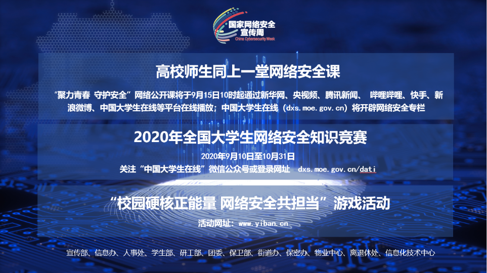 首页网9月23日电 第七届国家网络安全宣传周于9月14日至20日举行。为深入学习贯彻习近平总书记关于网络强国的重要思想,提升全校师生网络安全意识和防护技能,营造清朗的网络环境,学校结合疫情防控形势,制定工作方案,校党委宣传部、信息办、信息化技术中心、保密办、人事处、学生部、研工部、校团委、保卫部、街道办、物业中心、离退休处等多部门积极响应、协同联动,积极组织开展网络安全周系列活动。