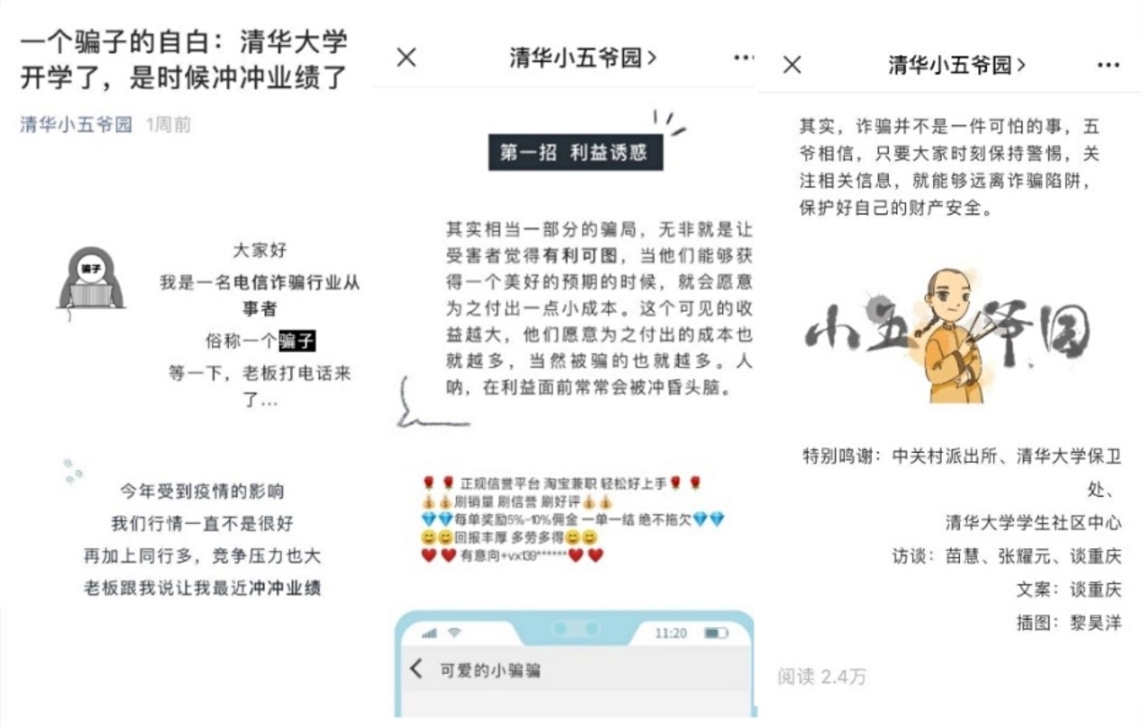 在线下,“钓鱼邮件防范”巡展活动以及滚动大屏展播走进60余家院系单位和学生社区。在线上,依托网络和新媒体平台“清华信息化”“平安清华”和“清华小五爷园”等微信公众号发布《网络安全,清华教你怎么做》、《一个骗子的自白:心博在线登录入口开学了,是时候冲冲业绩了》等多篇宣传推送,用贴近青年学生的方式介绍网络安全相关知识和防电信诈骗方法,提升师生网络安全意识,营造清朗、安全、有序的网络环境。