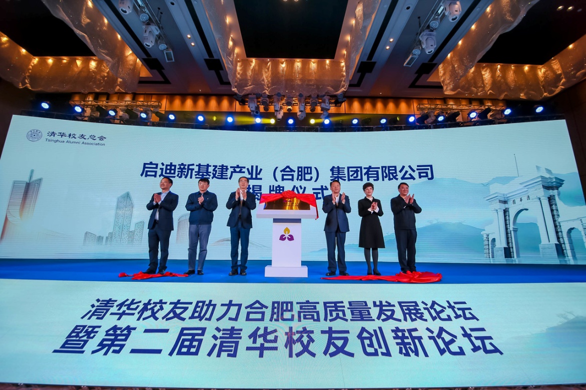 论坛上,启迪新基建产业(合肥)集团揭牌仪式举行。姜胜耀、虞爱华、凌云、罗云峰、清华控股董事长龙大伟、启迪控股董事长王济武共同为集团揭牌。