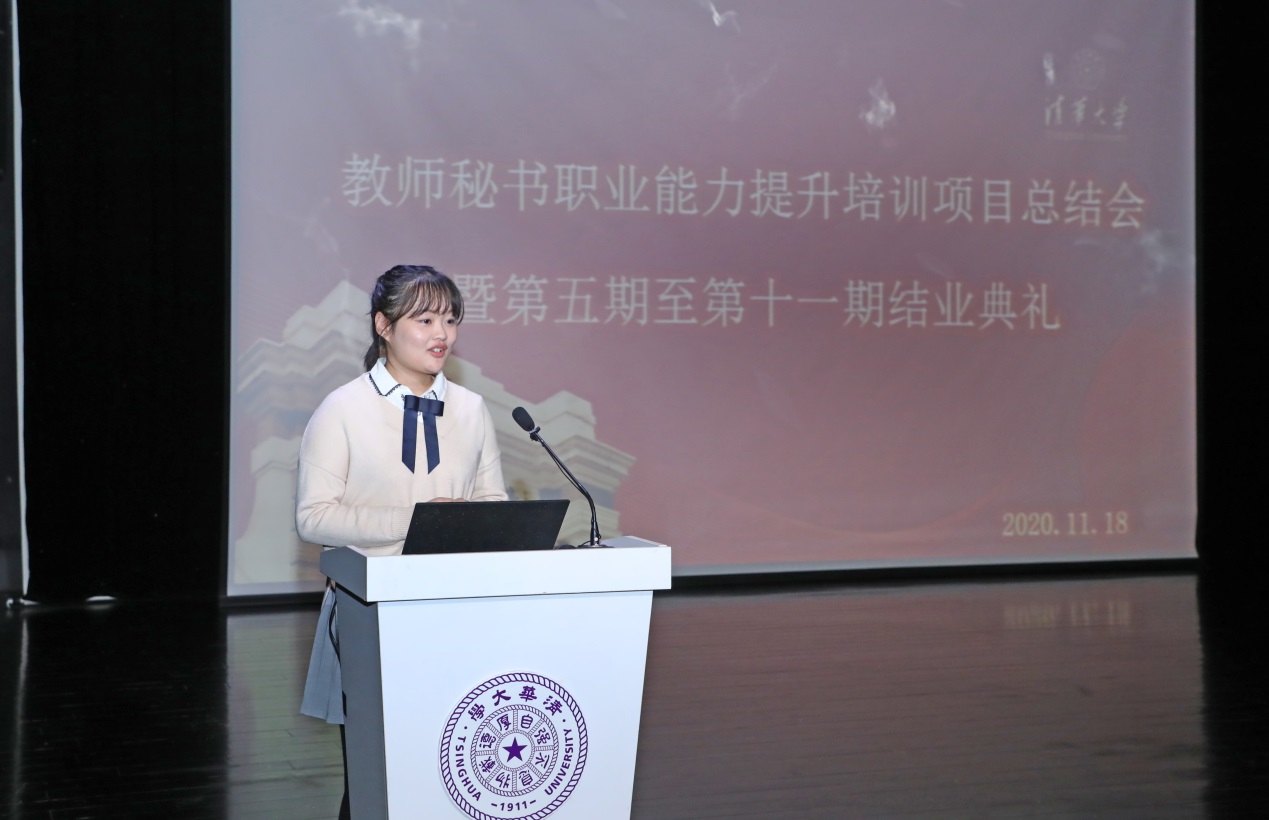 典礼上播放了1-11期教师秘书总结回顾短片。自2018年12月举办教师秘书培训第一期班至2020年7月教师秘书培训班第11期结业,共有962人参与学习,实现了全校教师秘书岗位人员首轮培训全覆盖。