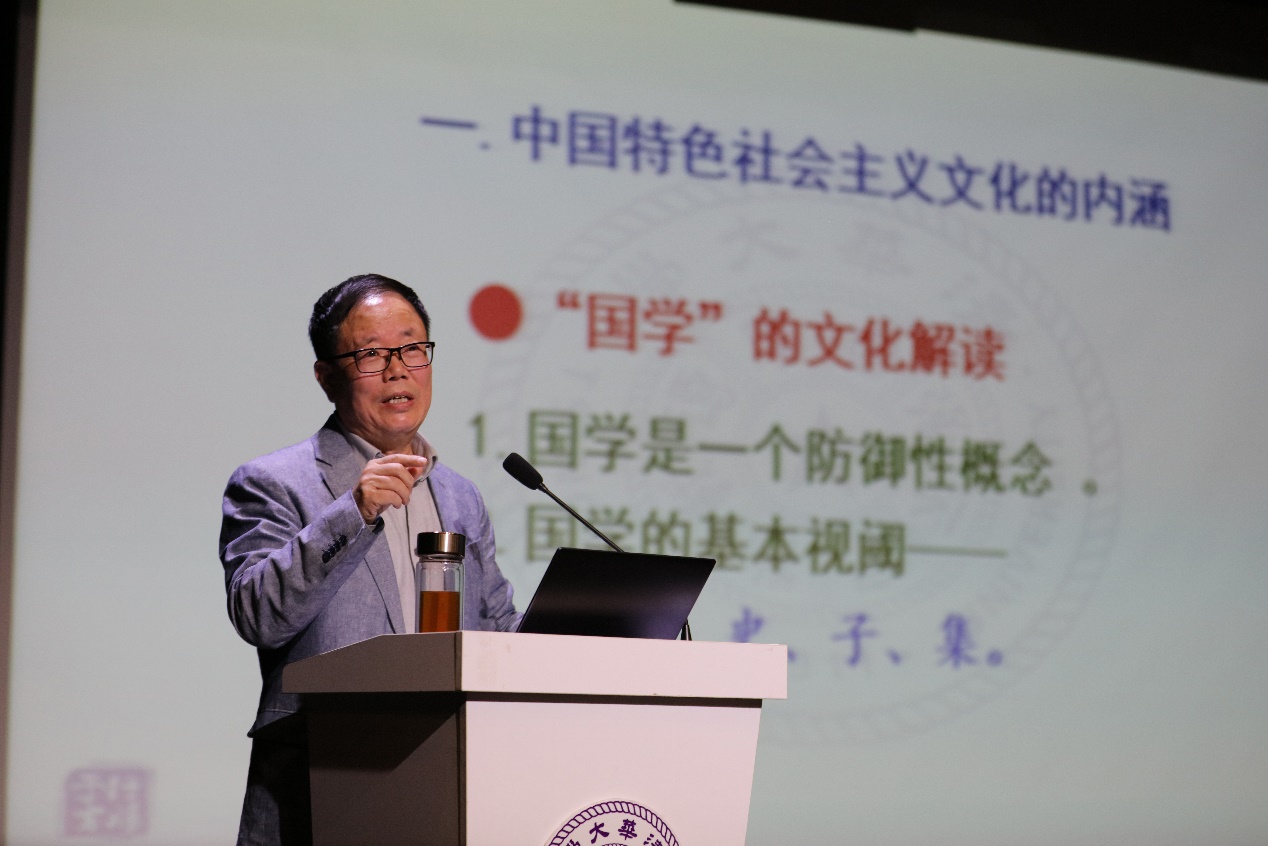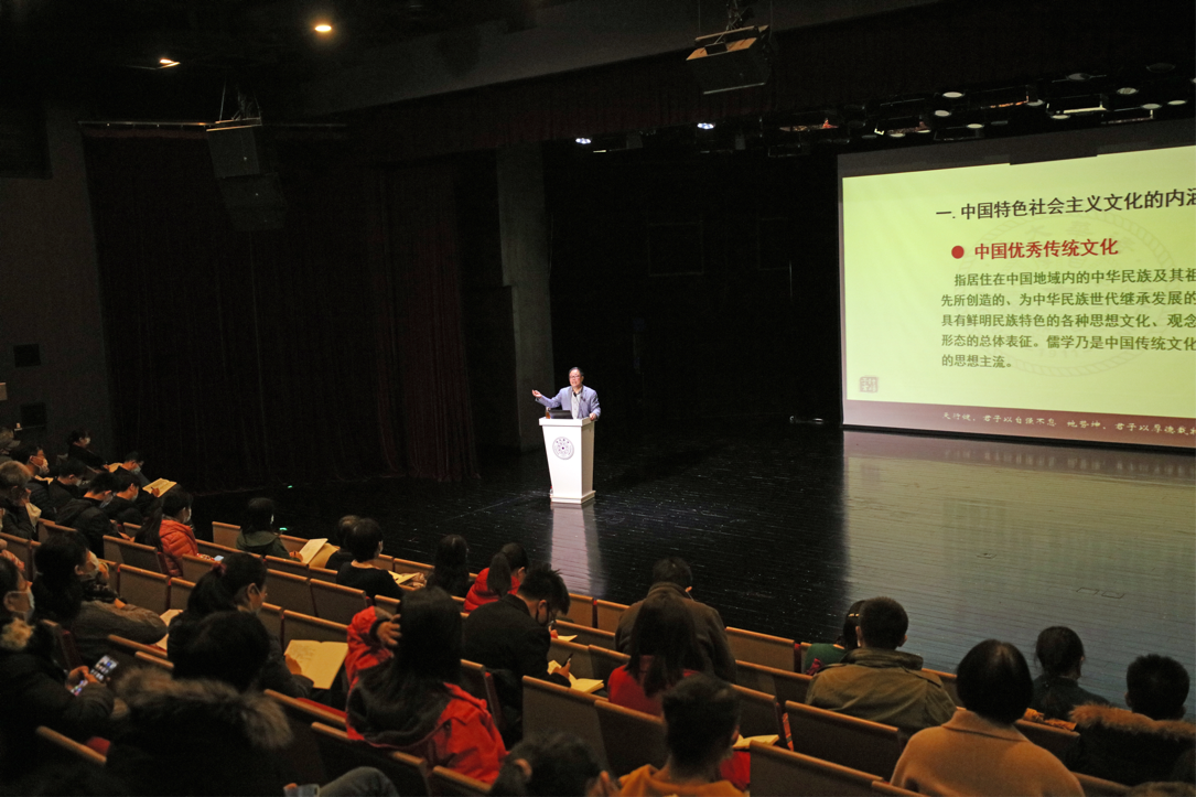 邹广文的讲座主要围绕“中国特色社会主义文化的内涵”和“推进中国文化繁荣兴盛之举措”两方面展开。他表示,习近平总书记在党的十九大报告中指出,“中国特色社会主义文化,源自于中华民族五千多年文明历史所孕育的中华优秀传统文化,熔铸于党领导人民在革命、建设、改革中创造的革命文化和社会主义先进文化,植根于中国特色社会主义伟大实践。”因此,建设中国特色社会主义文化,重点要从这三个层面来发力。中华优秀传统文化从中华民族五千年文明发展孕育而来,是中华民族继续发展的不竭动力和丰厚滋养,也是中国特色社会主义所根植的文化沃土;中国革命实践中所创造的革命文化是中国共产党领导中国人民在伟大的斗争中所建构的红色文化,它诞生于革命战争年代,承上启下,承前启后,始终处在具有旺盛生命力的状态,它是文化自信的一个重要源头,也是砥砺我们不忘初心、牢记使命的不竭精神动力;社会主义先进文化是指新中国成立以来,党领导中国人民建设社会主义国家总结的基本经验,形成的文化精神,社会主义先进文化的本质是坚持社会主义制度,精髓是社会主义核心价值体系。