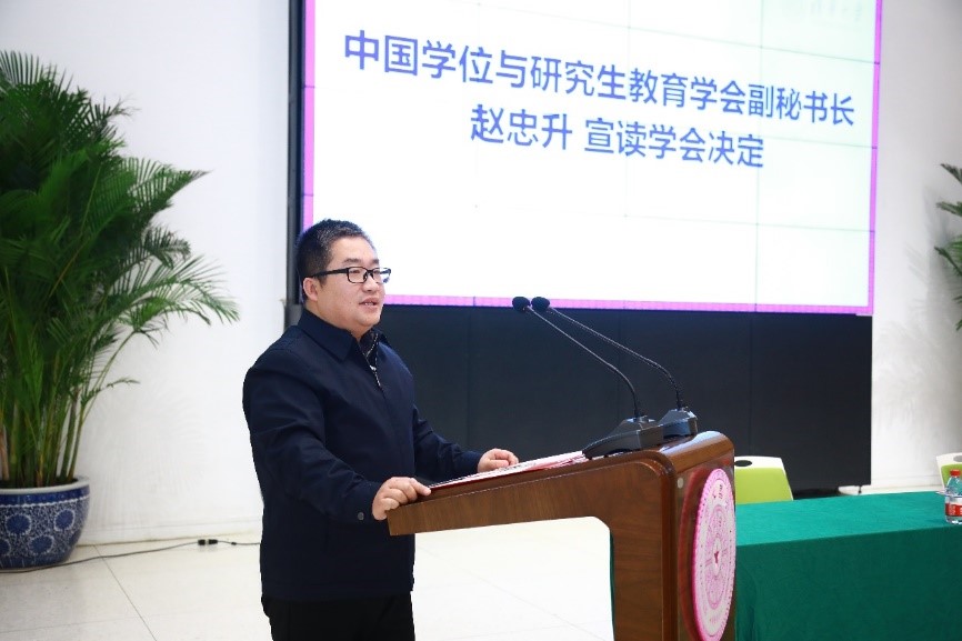 中国学位与研究生教育学会副秘书长赵忠升宣读了关于成立研究生职业发展教育委员会的决定,指出委员会须面向全体会员积极组织开展与研究生职业发展教育相关的理论研究、学术交流、书刊编辑、业务培训、国际合作、咨询服务、展览展示等活动。
