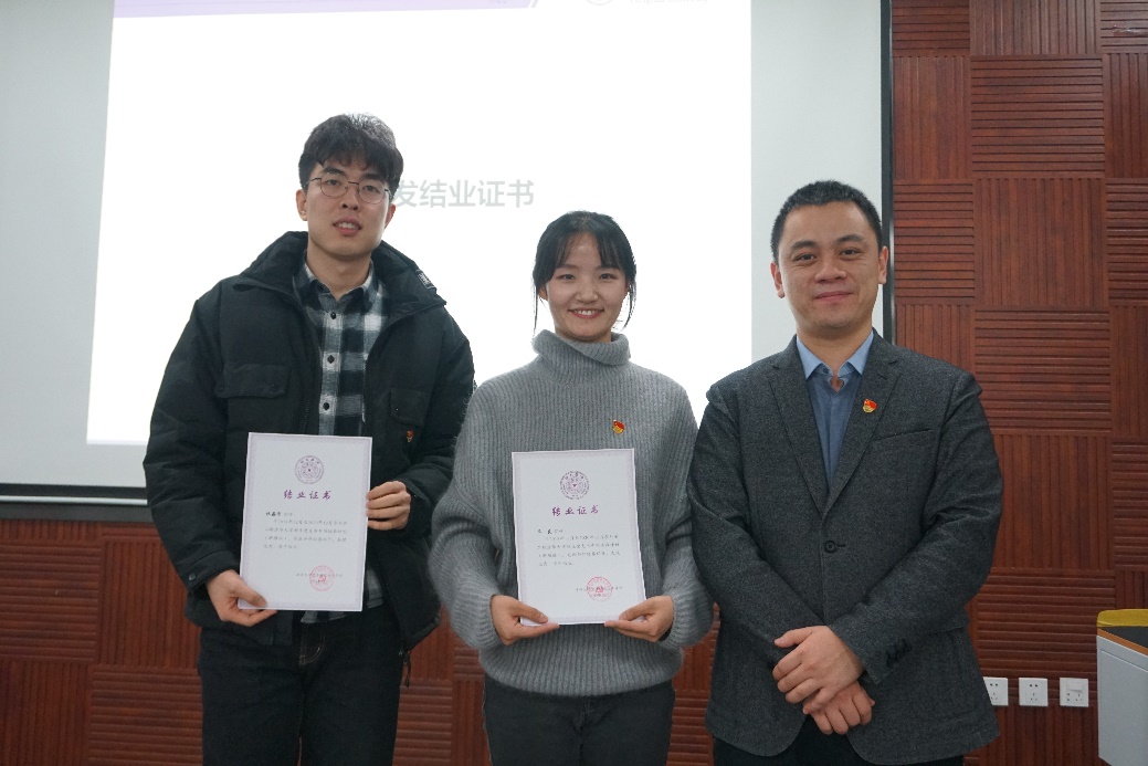 在结业环节中,“新雁二期”班主任、校党委研工部思教办主任任仕廷为结业学员颁发证书。辅导员、能动系2016级博士生刘明介绍了该期学员的培养成效;学员代表、公管学院2018级博士生单良分享了自己在“新雁班”的收获与感悟。