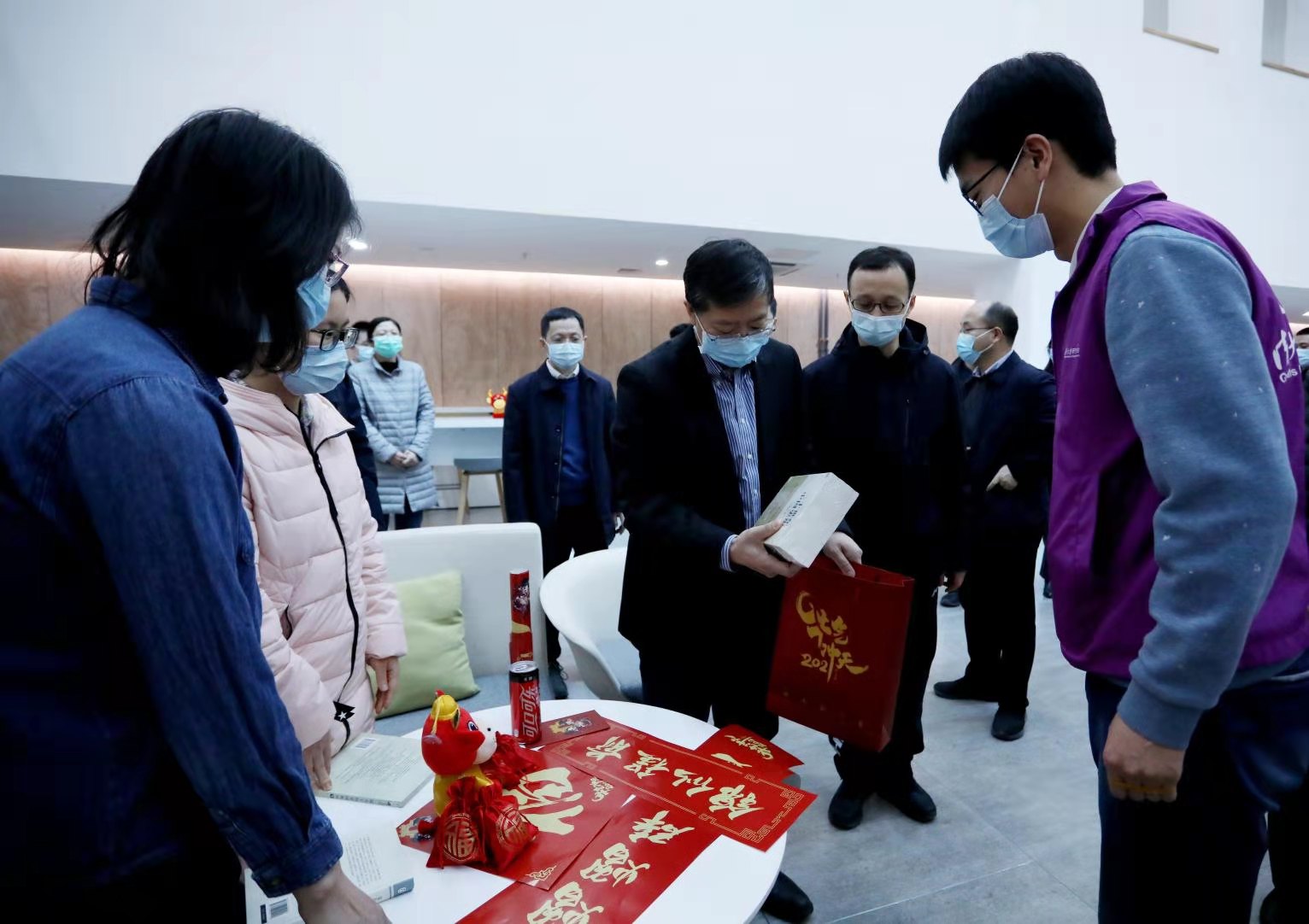 邱勇详细了解同学们学习生活情况,并装好一袋“牛气冲天”暖心礼包,送给了在场一位即将在牛年过生日的同学。
