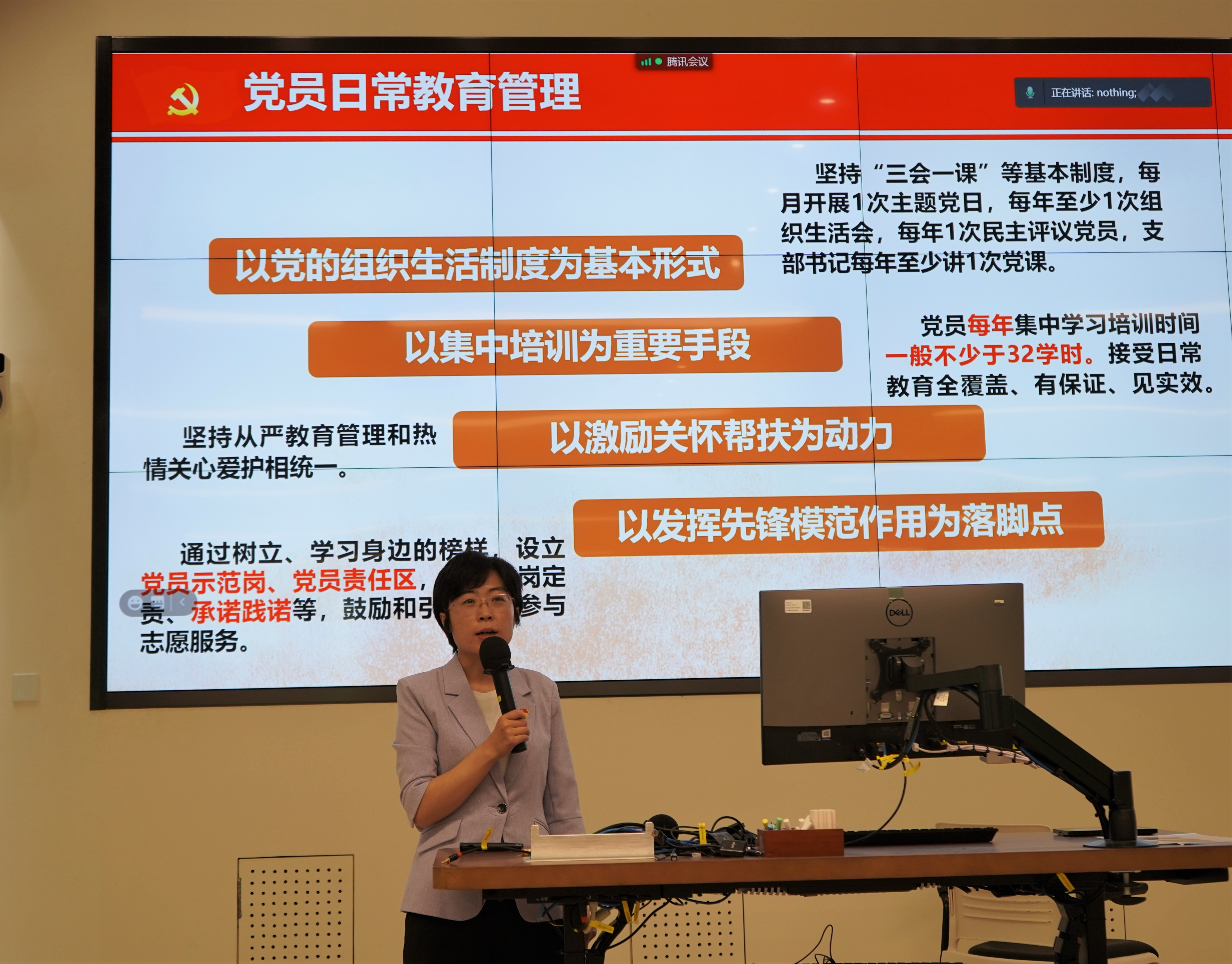 最后,梁静向大家介绍了党员教育培训、组织关系及党籍管理等要求,并讲解了党史学习教育工作安排,希望大家时刻牢记自己的第一身份是党员,主动加强理论学习,自觉遵守党纪党规,不断锤炼党性修养,立足本职岗位发挥自身优势和专长,努力成为一名政治合格、执行纪律合格、品德合格、发挥作用合格的共产党员。
