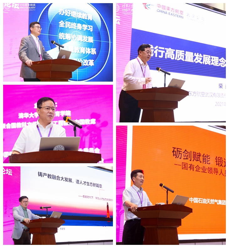 中国石油大学(华东)教育发展中心党委书记马国刚,中国核工业集团有限公司副总经济师、中国核工业教育学会理事长王安民,华为中国政企人才发展部部长李朝军,中国东方航空武汉有限责任公司董事长、党委书记柴舸,中国石油管理干部学院副院长李志刚分别作主题发言。