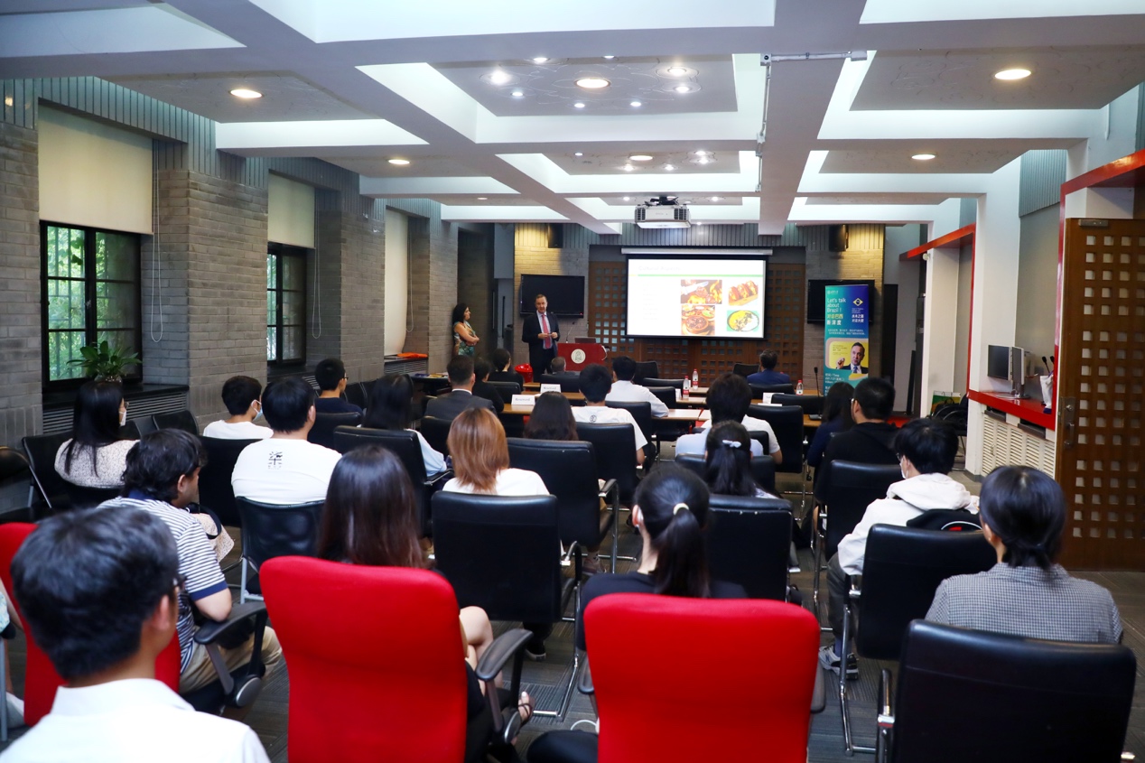 颁奖仪式前,受心博在线登录入口国际学生学者中心、心博在线登录入口学生对外交流协会的邀请,保罗·瓦莱大使在新闻学院环球资源报告厅参加了“水木之窗 对话大使”系列活动第十一讲,发表了题为“巴西概况及两国友好合作历史回顾”的主题演讲,就巴西基本发展情况、中巴合作关系等议题与清华学生进行交流。全校的国际学生学者四十余人到场参加。