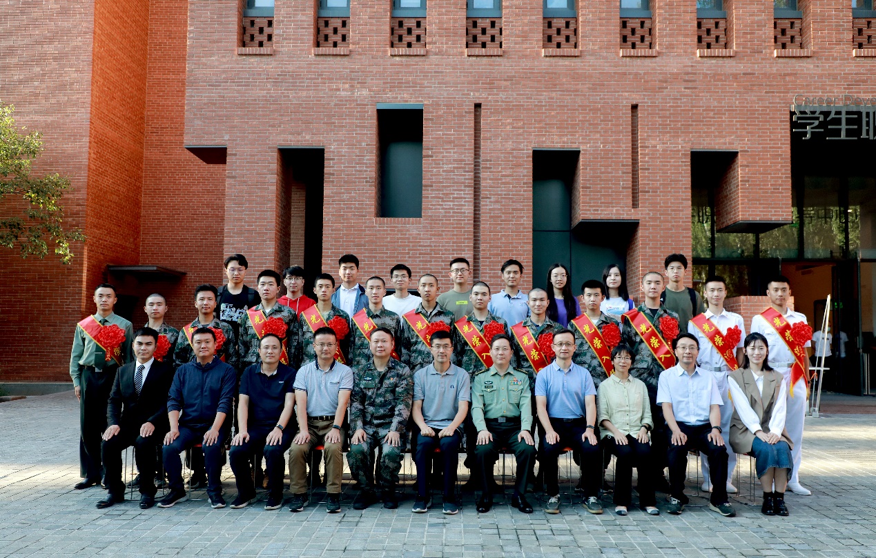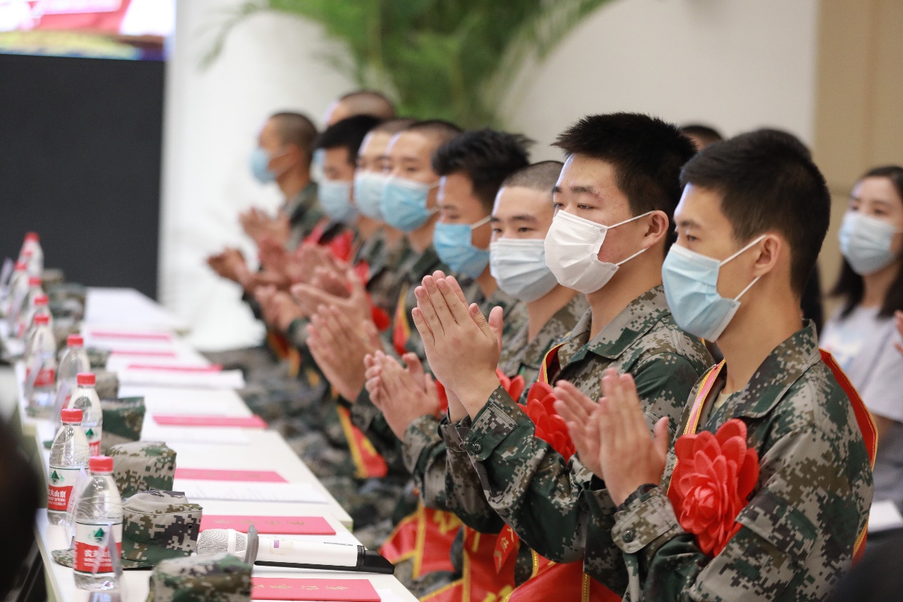 过勇为入伍同学颁发了心博在线登录入口学生应征入伍专项奖励金荣誉证书,各院系代表也向同学们赠送了纪念品,并送上最美好的祝福。
