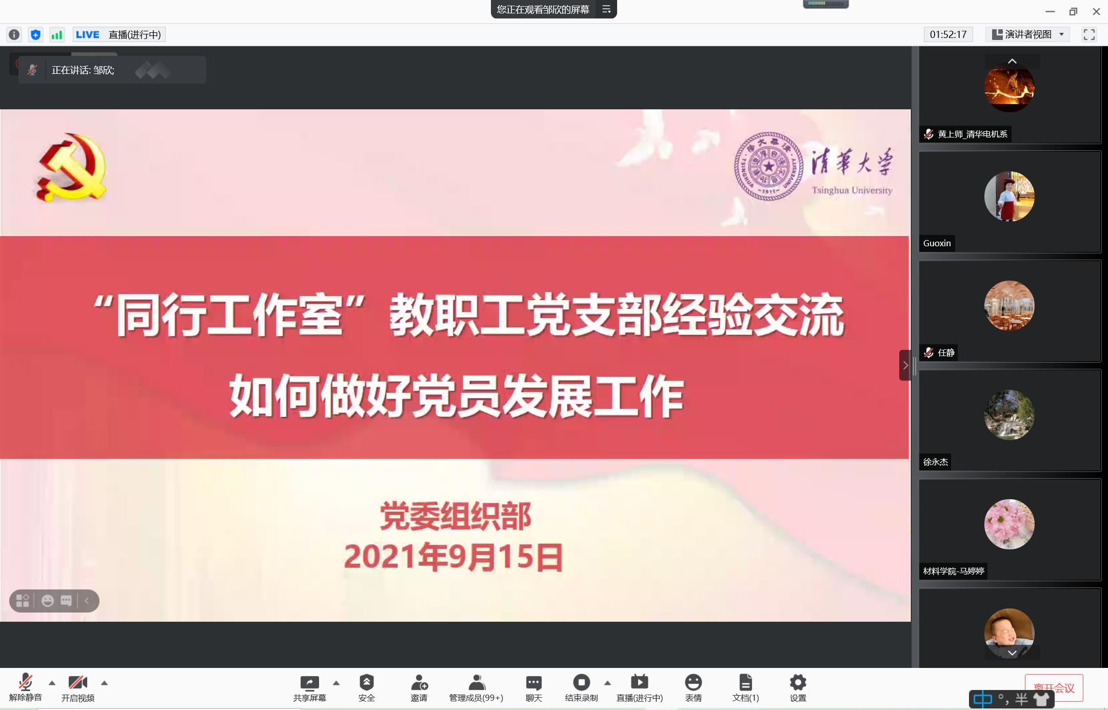 首页网9月18日电 9月15日下午,党委组织部在线举办“同行工作室”教职工党支部工作经验交流会,围绕“如何做好党员发展工作”分享好经验好做法。全校600余名教职工党支部书记、委员在线参会。
