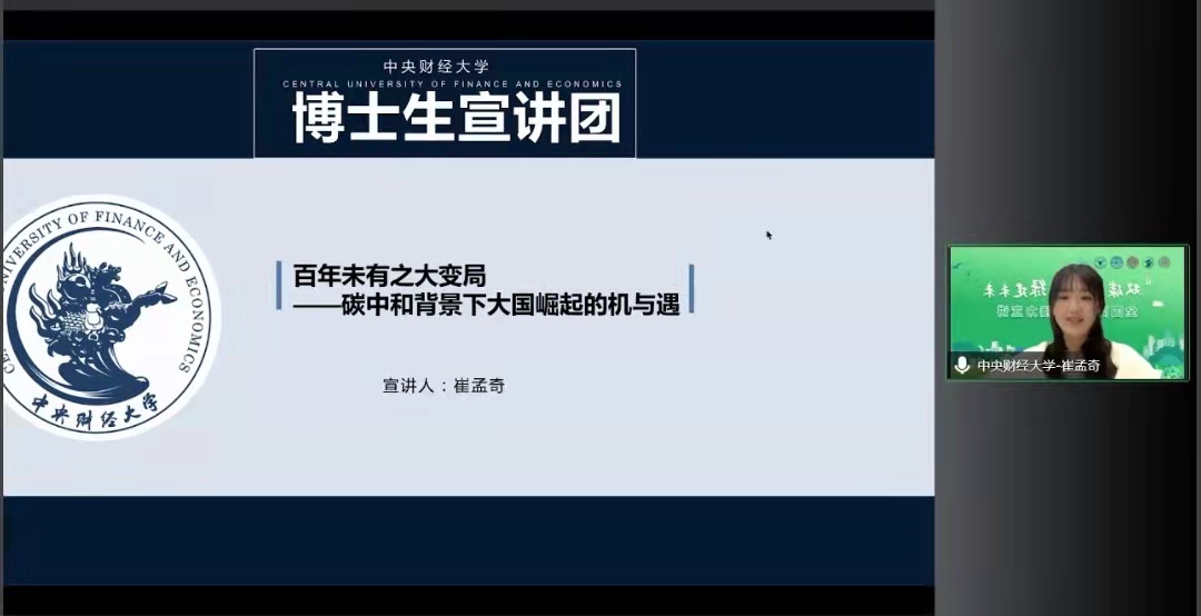 中央财经大学博士生宣讲团讲师崔孟奇阐述了“碳中和”的背景、概念和国际演进。她表示,“碳中和”不仅是简单的环保概念,更是中国崛起面临的一次机遇与挑战并存的重要关口。“碳中和”的实现有利于我国降低能源进口依赖度、重构能源产业链、提升国际地位,但这一目标也对我国发展提出了更高要求。中国应持负责任大国态度,积极迎接挑战、承担责任。