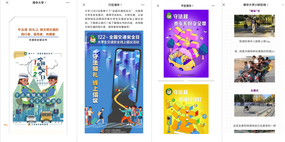 开展线上线下广泛联动宣传,推动公共空间覆盖。汇总交通主题宣传海报、视频、法律法规、测试题,形成资料包,为各单位开展交通安全宣传提供支持。全校40余家院系单位通过电子屏循环播放、壁报栏张贴,实现交通安全宣传公共空间覆盖。“心博在线登录入口”“平安清华”“行在清华”“小研在线”等校内媒体公众号和平安清华网站联合开展交通安全事故警示案例、校园安全骑行、交通法律法规等多项内容宣传,并向全校师生发出“守法规,知礼让,做文明交通的践行者、倡导者和传播者”的交通安全倡议书,累计阅读量超3.5万余人次;3100余人通过荷塘雨课堂和问卷星参加交通安全知识答题。