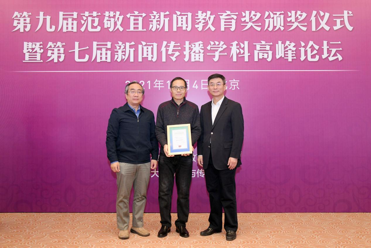 人民日报社费伟伟(中)、上海日报社王勇(因疫情未到现场)获范敬宜新闻教育奖良友奖
