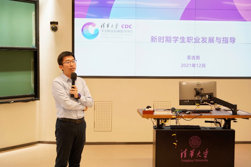 董吉男在主题报告中详细介绍了学校新时期学生职业发展与指导的基本情况。他指出,对学校而言,就业工作是人才培养过程中具有战略意义的关键环节,只有把精心培养的优秀人才输送到正确的地方,才能充分发挥学校的人才优势。他指出,要针对同学自身特点选择最适合自己的职业,在职业选择上要做到稳定性与成长性的平衡。