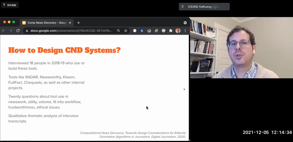 聚焦智能新闻生产,美国西北大学传播研究和计算机科学副教授、计算新闻实验室 (CJL) 主任、技术/社会行为 (TSB) 博士项目主任尼古拉斯·迪亚科普洛斯(Nicholas Diakopoulos)就算法新闻研究(Computational News Discovery)作了主旨发言。
