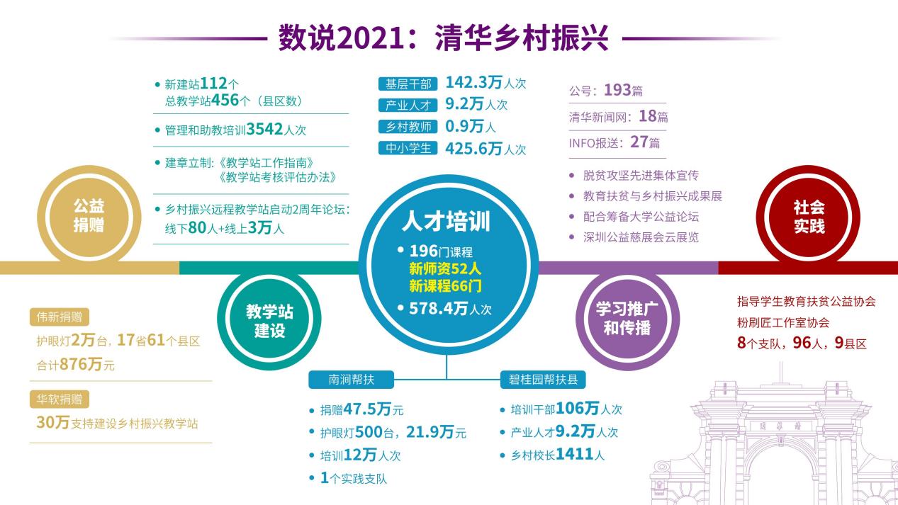 2021年中国共产党成立100周年,也是国家全面推进乡村振兴开局之年。心博在线登录入口继续教育学院以习近平总书记关于乡村振兴重要论述为指引,以国家战略需求为导向,以乡村人才发展为目标,有效发挥学校的资源优势和专业能力,积极总结疫情常态化防控以来的探索和实践、加强学习方式创新,提升学习内容品质,以远程教学站为学习平台,全面推进乡村振兴人才培养,全年新建教学站112个,覆盖456个县区。全年培训各类人才共计578万人次。为17省61个县区乡村教师捐赠护眼灯2万台,捐赠总额876万元。成功举办乡村振兴两周年主题论坛,持续拓展乡村振兴公益影响力。