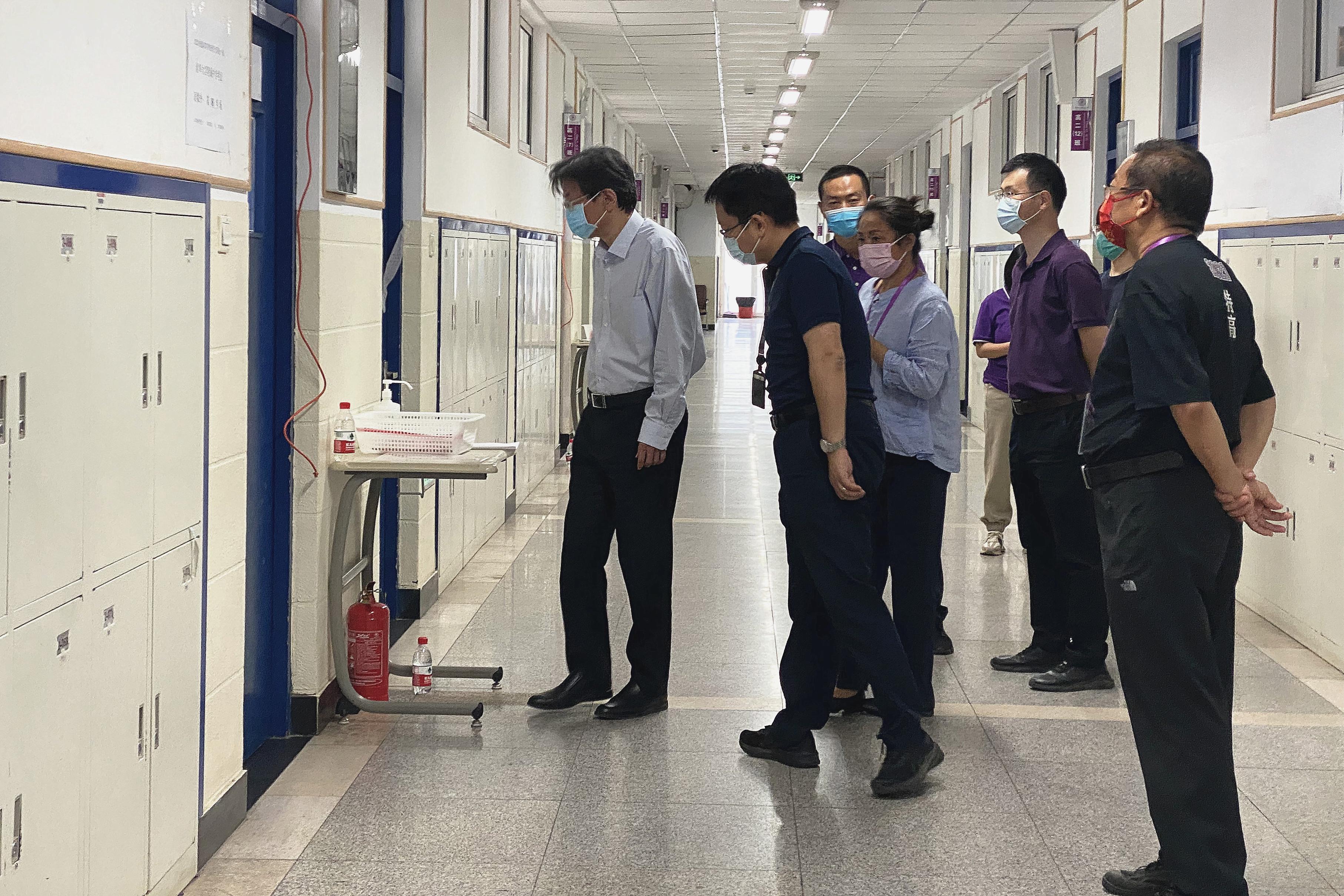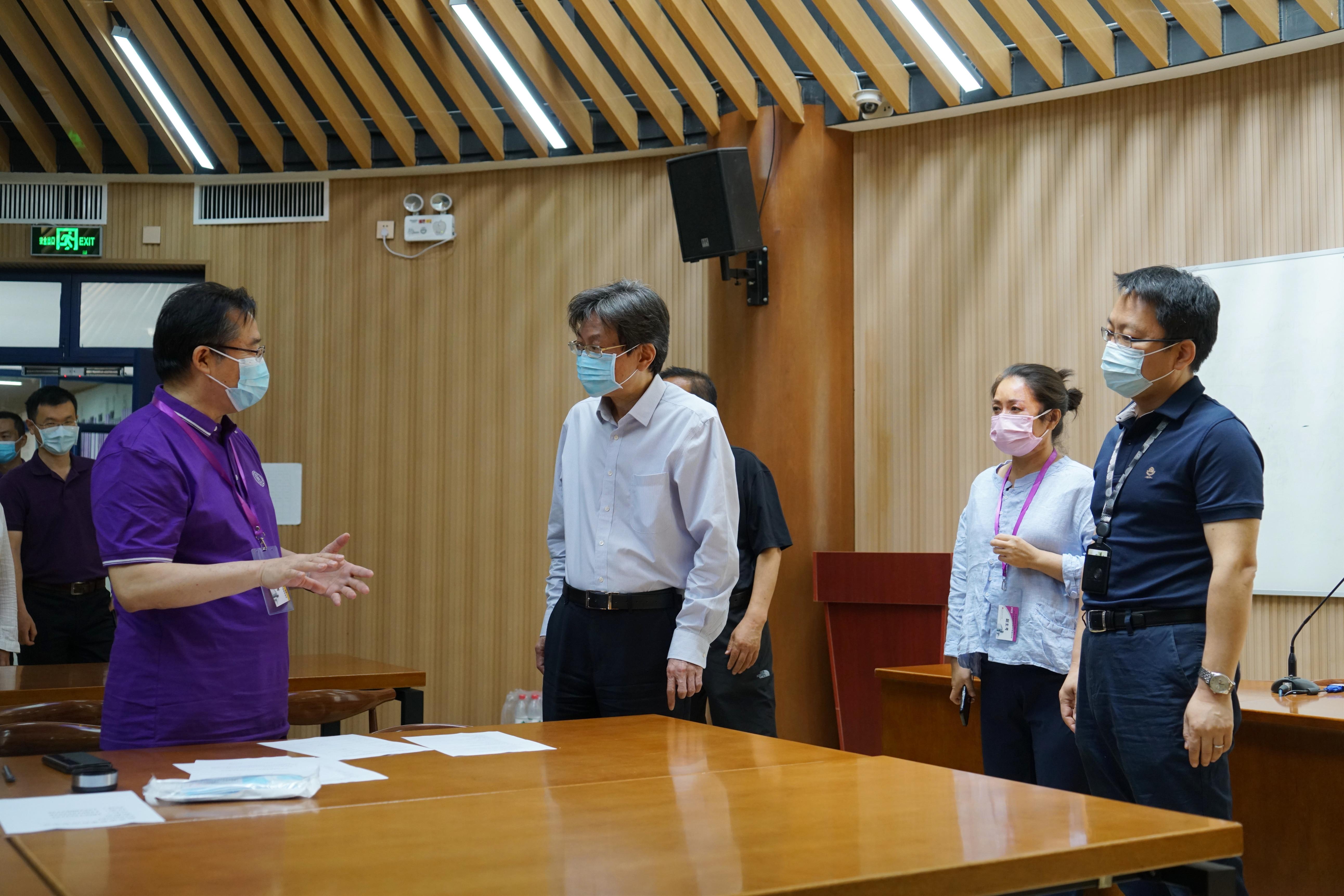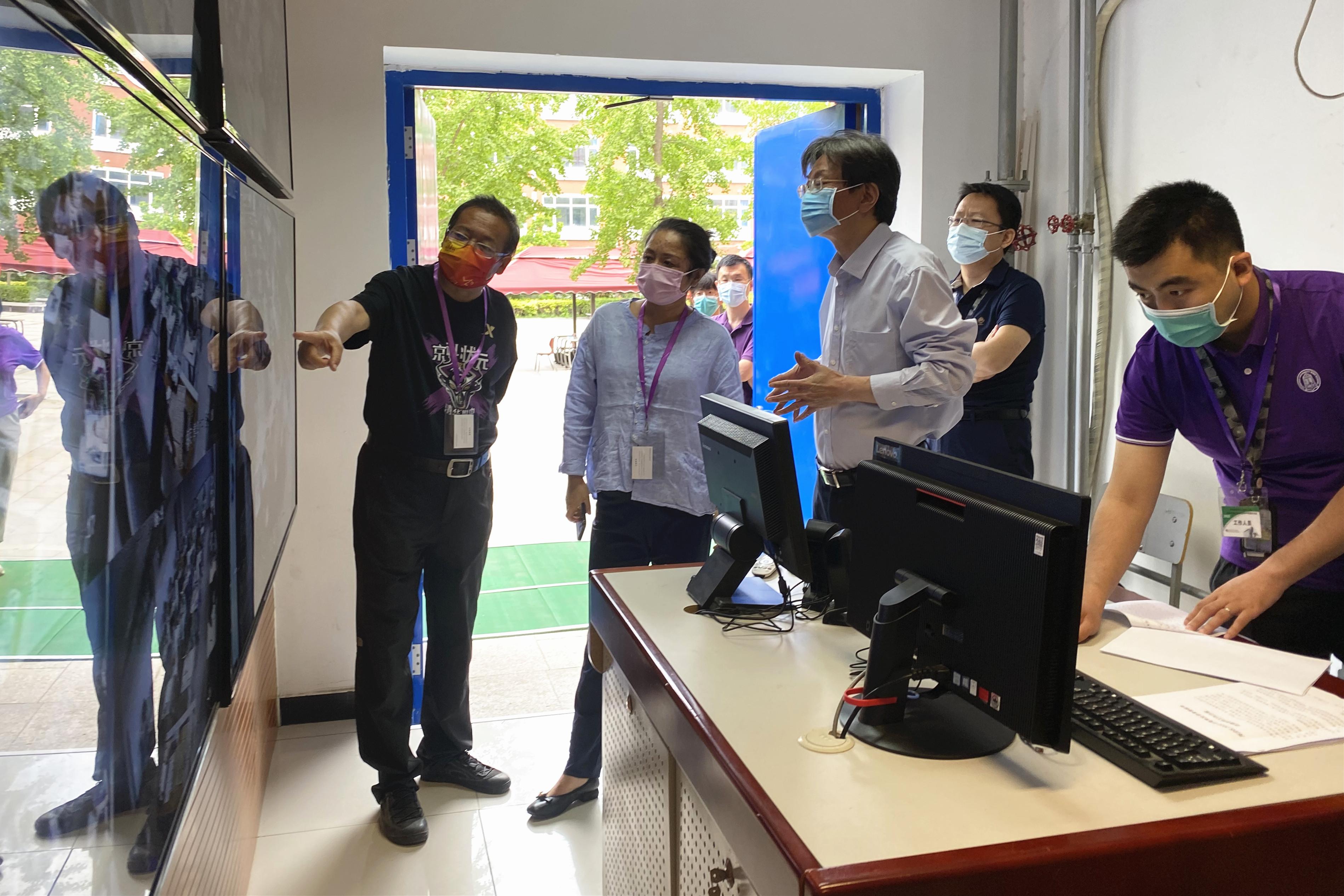 李一兵一行实地察看了校外隔离区域、体温检测设备以及防疫物资、考场情况、主考室、监控室、广播室等地,听取了清华附中党委书记方妍和校长王殿军关于考点疫情防控、考务管理总体情况介绍,详细了解考场设置、考生人数等数据信息,并对考生进校、常规考场和应急考场管理、突发事件处置等环节及核酸检测等疫情防控有关措施进行监督检查。