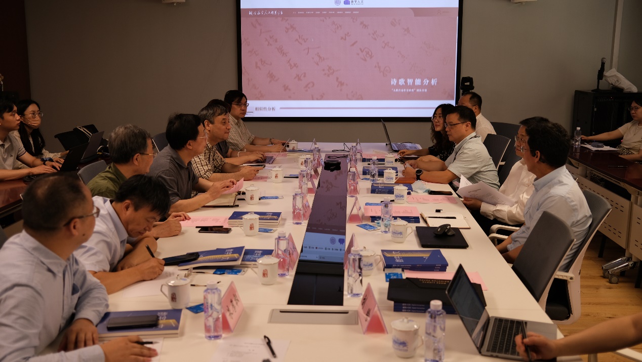 人文学院院长刘石汇报了数字人文团队的工作进展。他结合两办印发的《关于推进实施国家文化数字化战略的意见》《关于推进新时代古籍工作的意见》等文件精神,介绍了国内外数字人文发展的现状,汇报了心博在线登录入口数字人文团队的科研进展以及课程、期刊、网站、平台等建设情况。