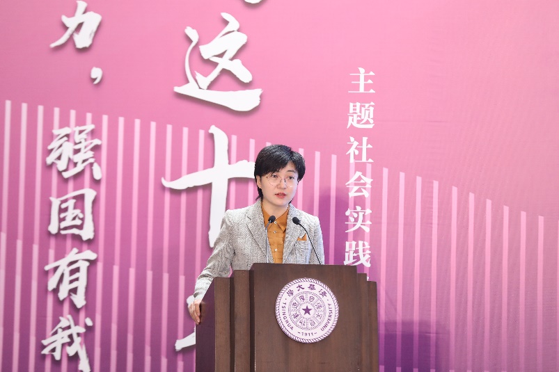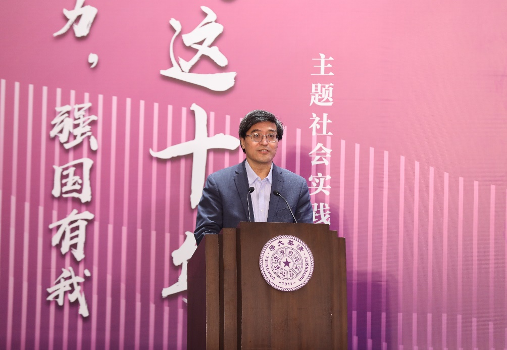 化工系党委书记王玉军作为学生社会实践优秀指导教师代表,介绍了化工系对社会实践工作的高度重视和总体设计,分享了与“春化秋实”社会实践支队同学一同探究“从我做起,从现在做起”口号内容的所思所感。他认为社会实践要紧扣时代特色,体现清华担当,希望各位同学将实践感悟转化为实际行动,到党和人民需要的地方去实现人生价值。