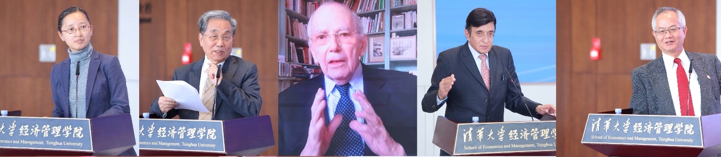 廖莹主持活动,张之骧、米歇尔·康德苏、辛格、苏育洲先后发表演讲(从左至右)