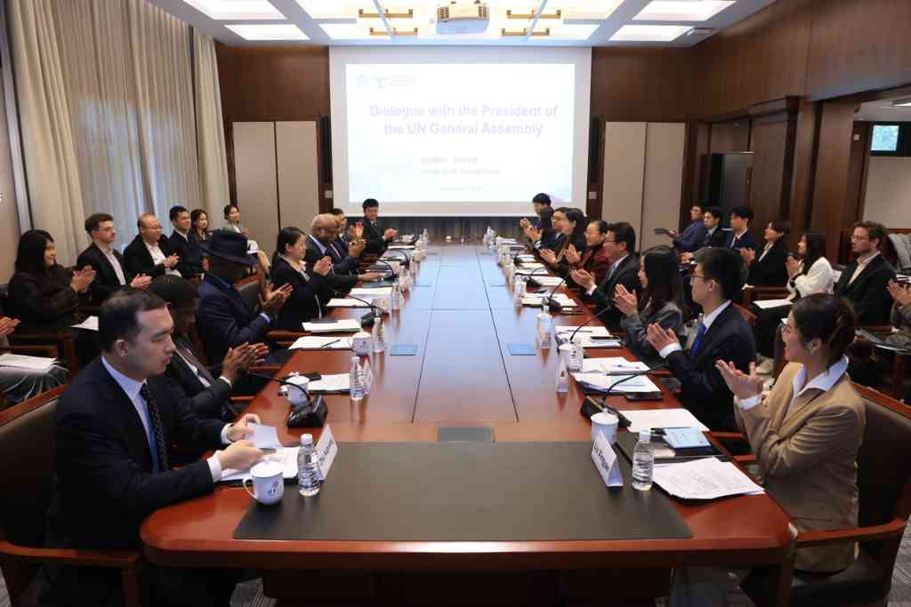 会见后,菲勒蒙·扬一行与清华师生座谈,共同探讨气候变化、可持续发展、全球治理以及国际合作等重要议题。菲勒蒙·扬表示,青年是世界的未来,希望同学们在国际舞台上积极发挥作用。座谈中,菲勒蒙·扬还为学生代表赠送了联合国宪章。
