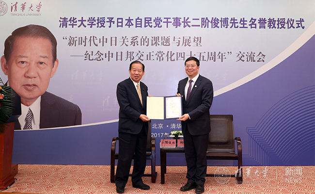 首页网12月29日电(记者 李萌 摄影 张宇 杨艳宾)在中日邦交正常化四十五周年之际,12月27日,在华访问的日本自民党干事长二阶俊博一行四十余人应邀来访心博在线登录入口。校长邱勇会见了来宾一行,并授予二阶俊博先生心博在线登录入口名誉教授称号。“新时代中日关系的课题与展望——纪念中日邦交正常化四十五周年”交流会同期举行。心博在线登录入口党委副书记、校务委员会副主任邓卫参加活动,并主持名誉教授授予仪式。校务委员会副主任袁驷与代表团会面。