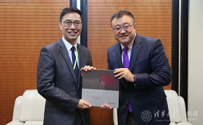 杨斌和香港教育局副局长杨润雄互赠纪念品。