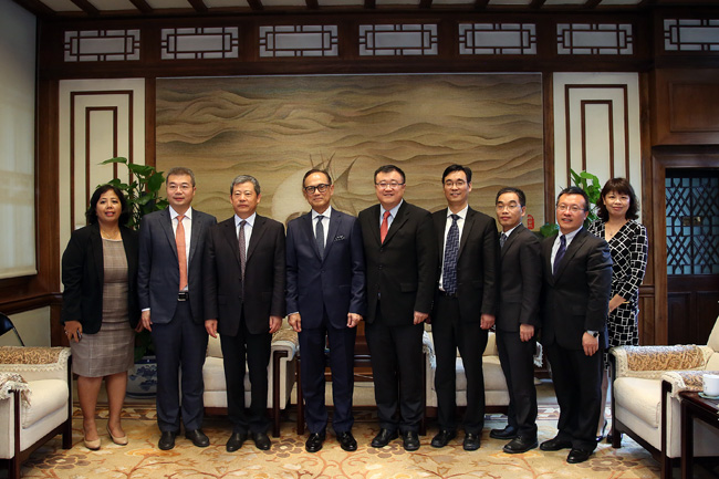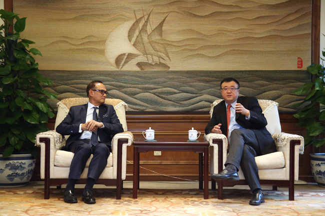 首页网7月26日电(通讯员 宋小岑) 7月25日上午,印尼工商会荣誉主席苏里约、中国民生投资股份有限公司(“中民投”)总裁李怀珍先生访问我校,杨斌副校长在工字厅西厅会见了苏里约、李怀珍一行。