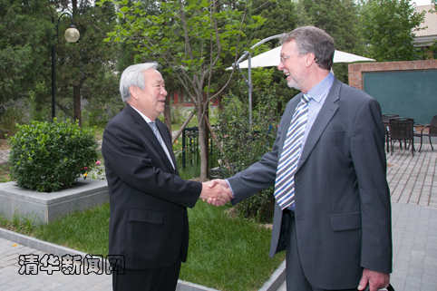 顾秉林向Ernst Rank教授讲解高等研究院的情况。记者 张 宇 摄