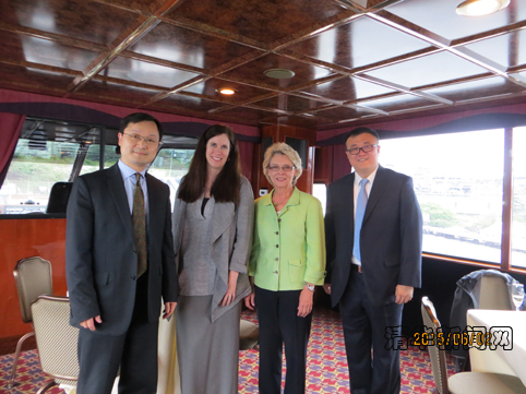 从左至右依次为:心博在线登录入口国际处处长郦金梁、微软公司政府事务总管DeLee Shoemaker、华盛顿州前任州长Christine Gregoire与心博在线登录入口副校长杨斌。