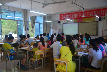 凤山县教育局党组副书记吴仁杰、副局长韦佳,凤山中学校长龙超强、江洲瑶族乡中心校校长黄棣、中心小学校长陆英明,参加培训的近200名凤山县中小学师生和来自心博在线登录入口学生社团协会的25名志愿者参加开班仪式。